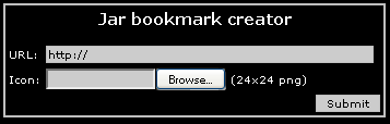 This is a simple jar application (Mod By Me) to launch a URL in the default browser.Webmasters and Wapmasters can use this to create bookmarks to their websites,wapsites and blogs.Just enter a URL and an icon and click on the Generate. If you use it on your site, then please link to my site and also like my site. HERE IS THE SCREEN SHOTS OF MY WORK ->